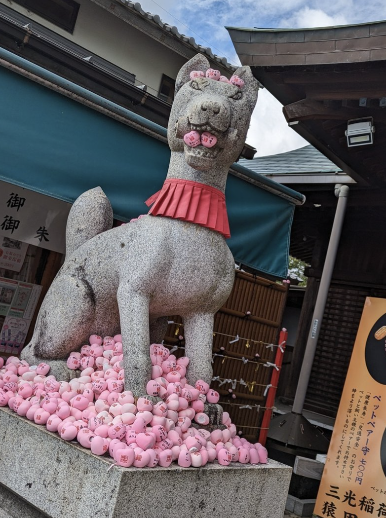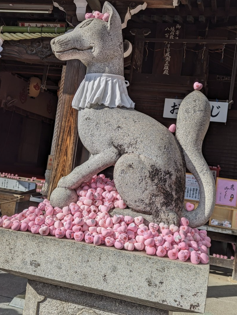 こんな感じで容器にも願いを書いて境内のあちこちに置いてありました。お稲荷さんの頭の上とか口の中とか、こぼれ落ちちゃってるものとか。