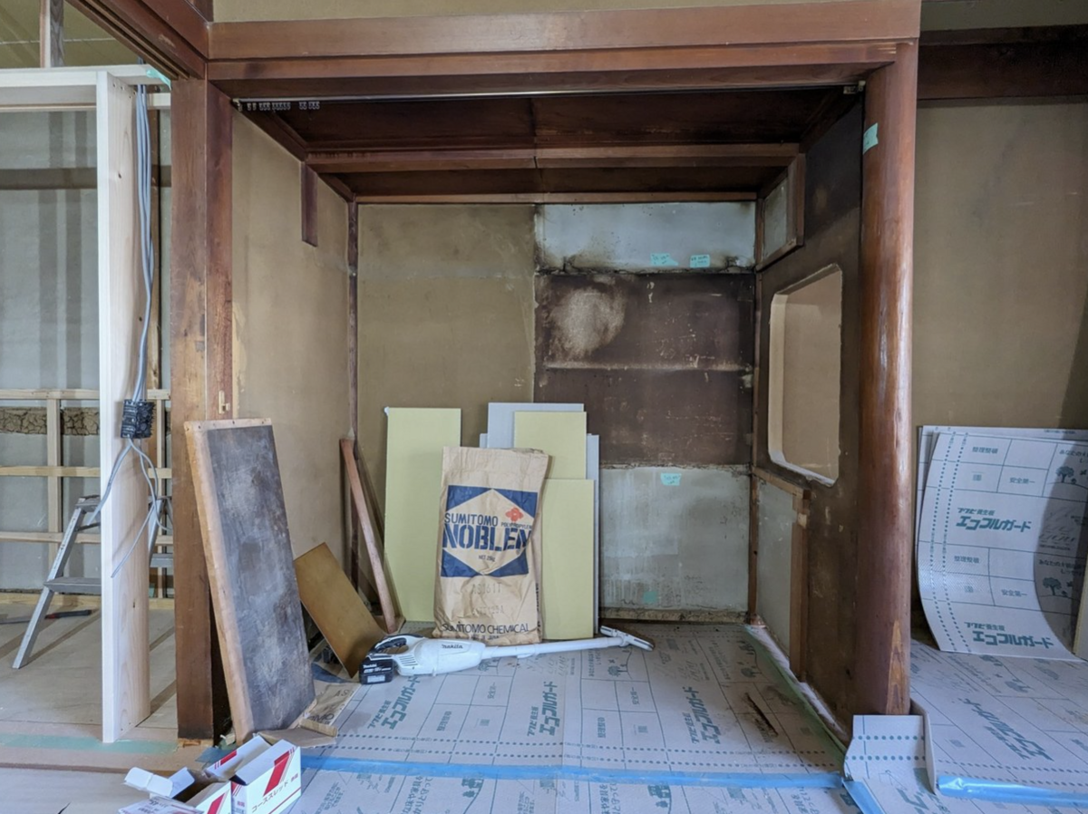 もともとは神棚が置かれていた場所でここをどう使おうかはっきり決まっていませんがちょっとツギハギ感が強いので綺麗にしましょう、となりました。