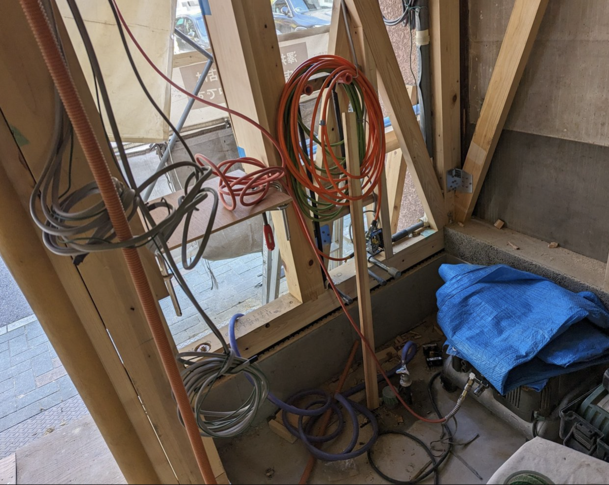 ここはエントランス付近のレジカウンターエリアです。電気のコード、給排水、筋交い、壁付の水栓金具が付く所、といろんな物がごちゃごちゃとあわさります。