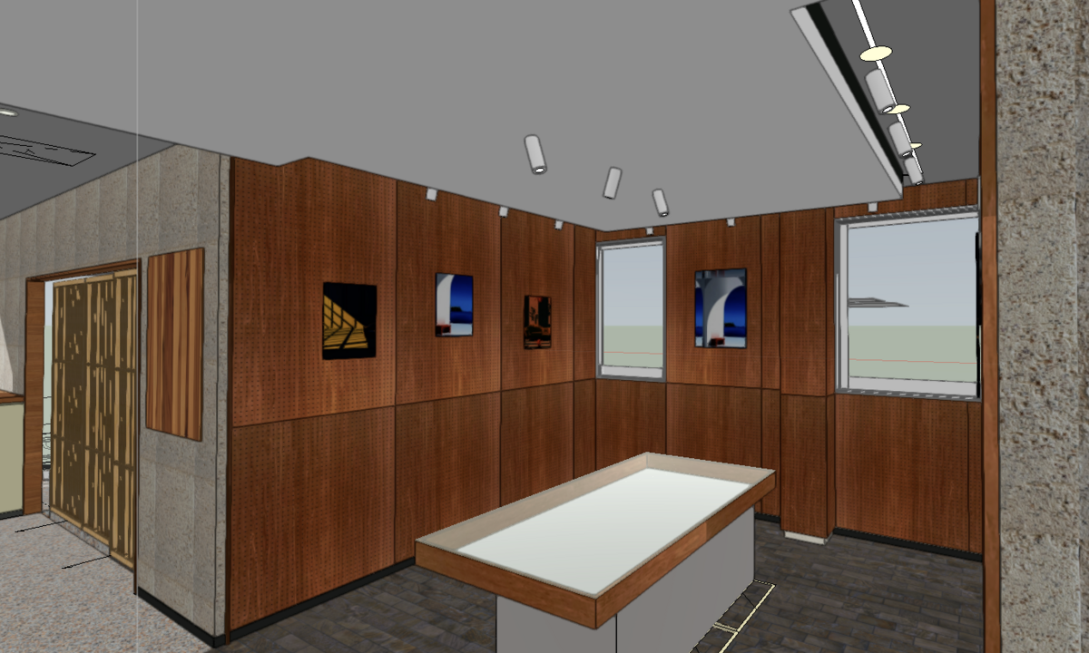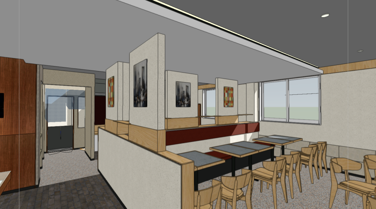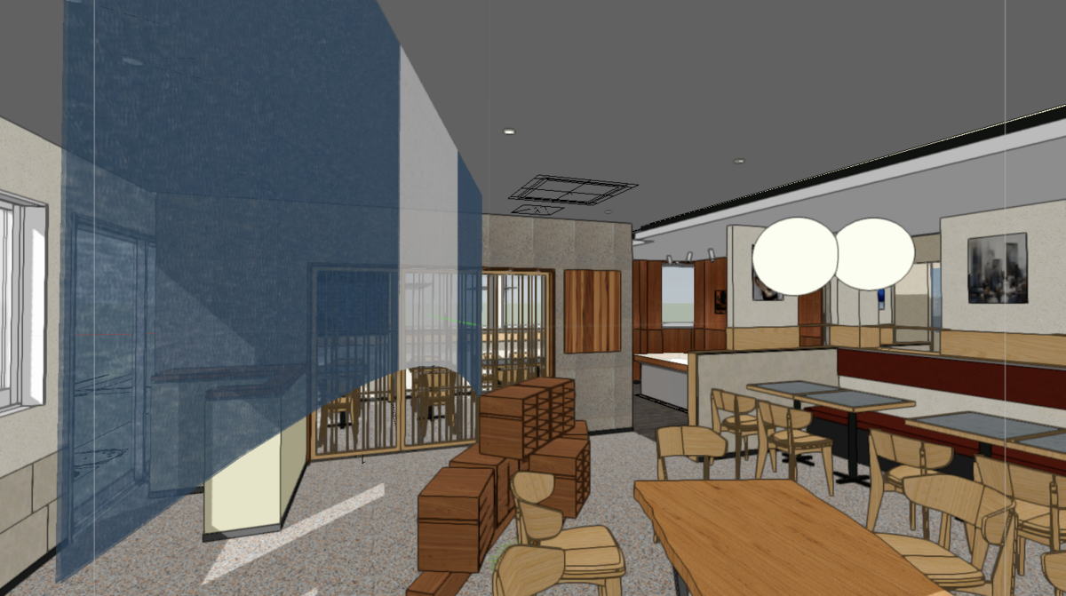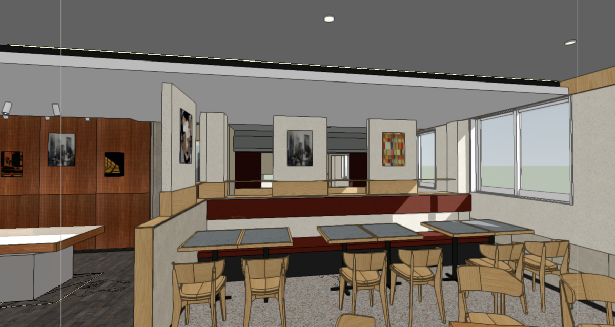飲食店ですがギャラリーを併設しています。パース画像左側の板貼りの空間がギャラリーです。